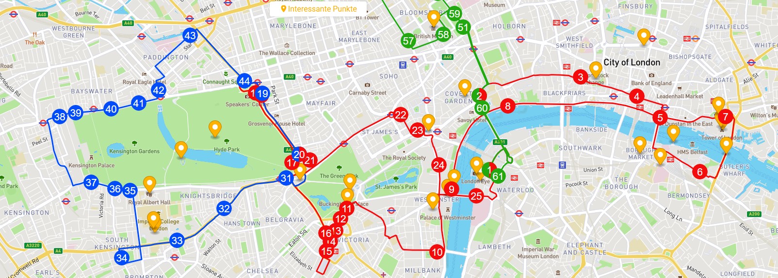 Red Route: 1 Belvedere Road, 2 Aldwych (One Aldwych Hotel), 3 Ludgate Hill (St Paul's Cathedral), 4 Queen Victoria Street (The City), 5 London Bridge, 6 Tooley Street (Tower Bridge), 7 Tower Hill (Tower of London), 8 Victoria Embankment, 9 Westminster Bridge (Big Ben), 10 Horseferry Road, 11 Buckingham Gate (Buckingham Palace), 12 Buckingham Palace Road (Victoria Station), 13 Buckingham Palace Road, Stop Z12, 14 Grosvenor Gardens, 15 Queen Elizabeth Gate, Hyde Park, 16 Marble Arch (Speakers Corner), 17 Marble Arch (Park Lane), 18 Haymarket, 19 Pall Mall East (Trafalgar Square), 20 Westminster Bridge (South)